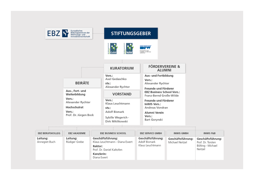 Unser Kuratorium spiegelt durch seine Zusammensetzung die Vielfalt und den Facettenreichtum der Wohnungs- und Immobilienwirtschaft wieder. Seine Mitglieder sind renommierte Akteure aus Verbänden und Unternehmen, denen qualitativ hochwertige Personalentwicklungsangebote für die Branche am Herzen liegen – denn sie glauben daran, dass die Qualität des Personals den Erfolg der Unternehmen heute und in Zukunft sichert.